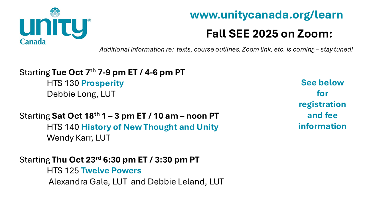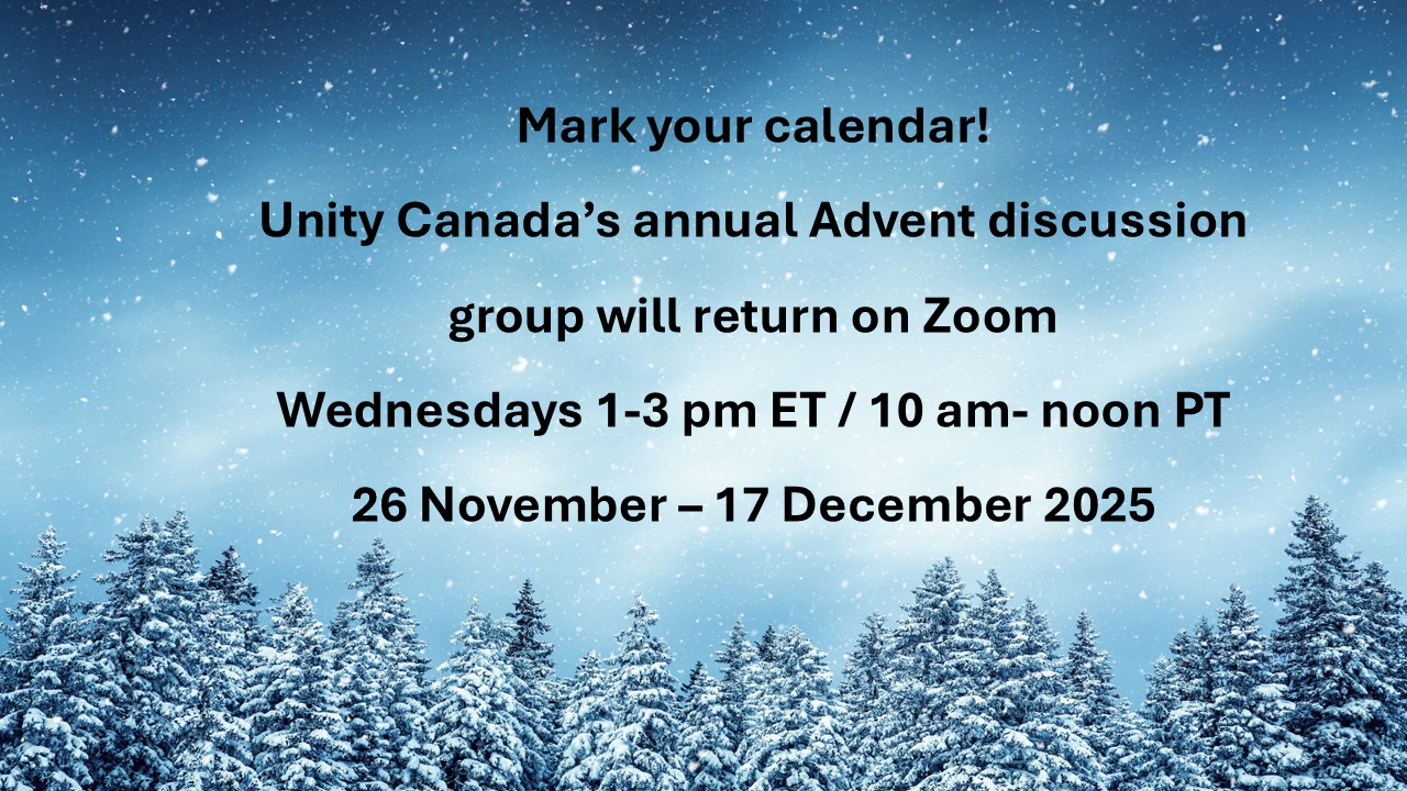Unity Canada's Annual Advent Discussion Group will return to Zoom on Wednesdays 1-3pm ET from November 26th to December 17th, 2025..